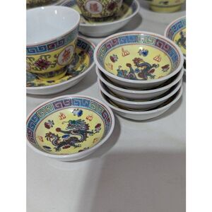 Vintage Porcelain Mun Shou Longevity Yellow Dragon 32 Piece Luncheon Set