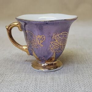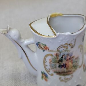 Charming vintage porcelain miniatures. Includes teapots, cups, and decorative shoes. Features intricate floral designs and gold accents.