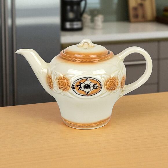 Steep your tea in style with this captivating vintage Porcelier teapot and lid! This charming piece features a beautiful cream-colored ceramic base adorned with an eye-catching brown medallion and a delicate sunflower motif accented in orange.