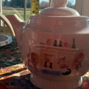 A medium sized white teapot with an embossed scene of a spinning wheel and cat in front of a fireplace on the front. It has a nice sized capacity and gives that empty shelf in your kitchen an old home feeling. It measures ~7 ½” tall, ~6” deep, and ~9” from handle to spout. It holds about 60 ounces or almost 8 cups of your favorite tea. The Maker’s Mark (Porcelier) is on the bottom. It's made in the USA from Vitreous China.