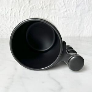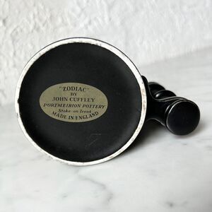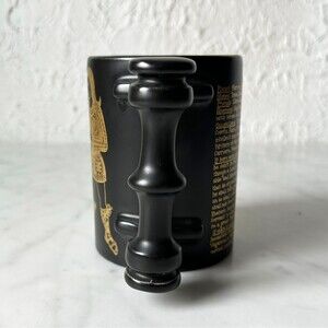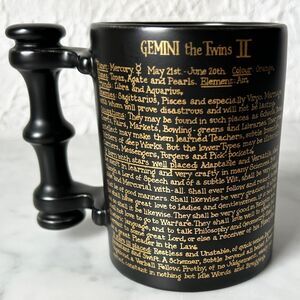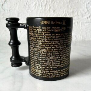Vintage Portmeirion Gemini astrological mug. Large matte black glaze cup with gold Gemini twins on the front and facts about Geminis on the back. Made in England by Portmeirion Pottery, designed by John Cuffley. The perfect birthday gift for the Gemini in your life! Very good vintage condition.