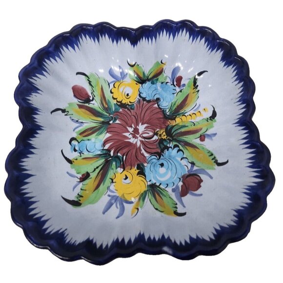 Vintage Portugal Pottery Floral Square Ceramic Serving Bowl Hand Painted Ruffle