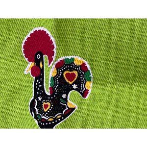 This little table topper or small tablecloth is 28 in square It is so vibrant and so bright it is only ever been folded in for and put away somewhere I think. I would keep this piece but I just simply have way too many linens. I put new without tags because it is very obviously never ever been used or even laundered it is 100% pure cotton