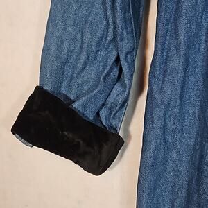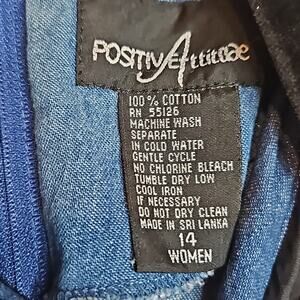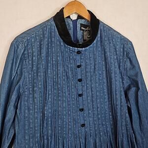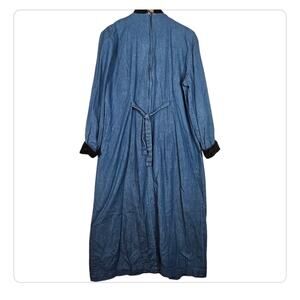 Vintage Positive Attitude Denim Pleated Maxi Dress with Velvet detail in excellent condition. Pleated at the bust, velvet buttons, cuffs and collar. Back zipper closure with small tie the back.