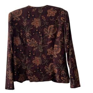 This stunning vintage velvet jacket by Positive Attitude features a rich paisley print in warm burgundy and rust tones, perfect for a boho-inspired look. Originally part of a two-piece set, this listing is for the jacket only. With shoulder pads for added structure and a soft, luxurious feel, it’s a unique statement piece. Note: The stitching along the back hem is undone (see photos for details).