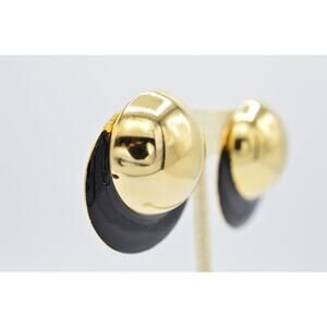 Vintage Post Round Earrings Black Enamel Shiny Gold Chunky Metal NOS 1980s BinAA