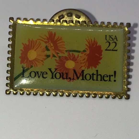 This vintage postage stamp pin that says Love You, Mother and is a value of 22 cents. The back of the pin says Winco International. It says stamp design 1997.