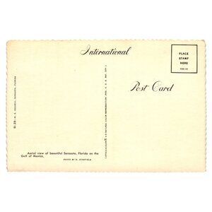 This vintage postcard showcases a vibrant aerial view of Sarasota, Florida, with scalloped edges and an unused back, making it a collector's item.