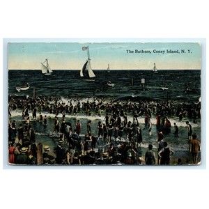 Vintage Postcard Coney Island New York City The Bathers Beach Sail Boat Posted