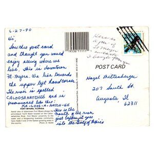 Front corners show minor wear; back has writing and a postmark dated June 27, 1990.