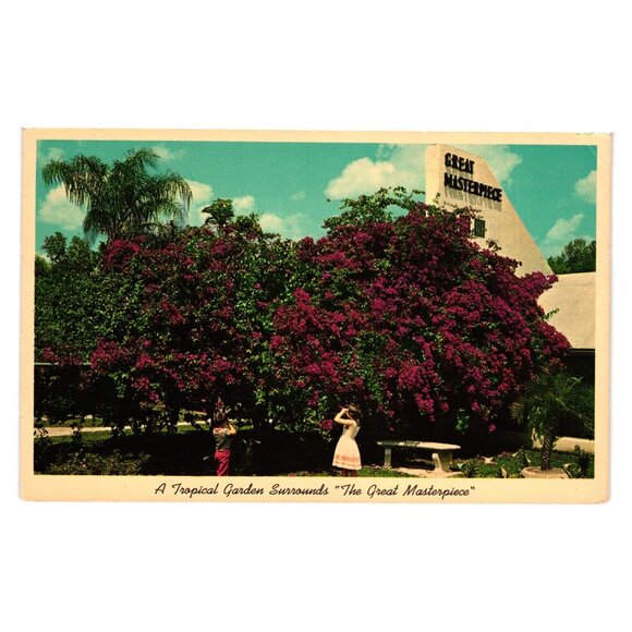 A charming vintage postcard showcasing the vibrant crimson bougainvillea at The Great Masterpiece in Lake Wales, Florida. Ideal for collectors or enthusiasts of historical postcards.