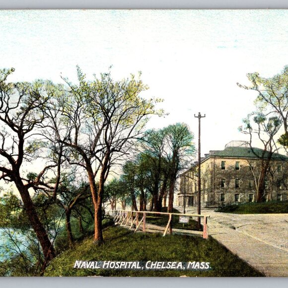 This antique postcard features a serene view of the Naval Hospital in Chelsea, Massachusetts. A pristine, unused collectible made in Germany.