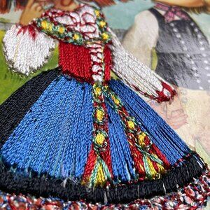 This rare Vintage Swedish postcard features a boy and girl at a fair. It is beautifully crafted from actual needlepoint and depicts a topographical standard. This is a unique piece of Scandinavian history and the perfect way to add a vintage touch to your collection.Features: