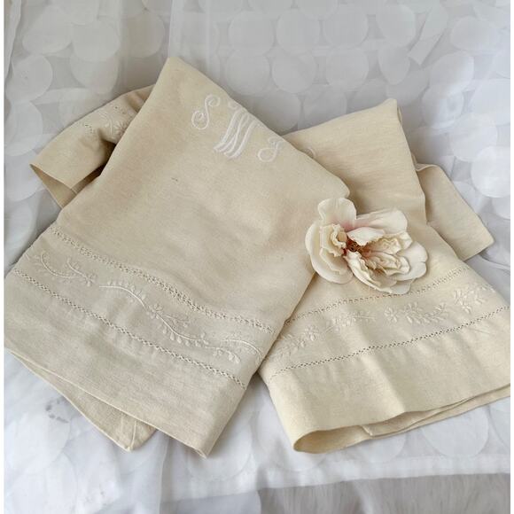 The product is a set of two vintage Pottery Barn linen and cotton pillow shams in beige color, featuring embroidered monograms. These rectangular standard-sized pillow shams are perfect for adults' bedrooms, adding a touch of French Country style to the decor. Made with high-quality materials, they are machine washable for easy care. The monogrammed shams are a charming and personal touch to any bedroom setting.