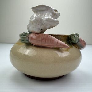 This vintage pottery candy dish features a cute bunny rabbit and carrot design, making it a perfect addition to Easter decor.