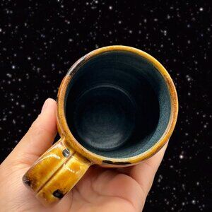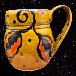 Vintage Pottery Coffee Mug Cup Hand Painted Leafs Black Dots Glazed 4”W 3.5”T