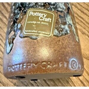 This Vintage Pottery Craft Vase is a stunning example of American art pottery from the late 20th century. Standing at 5 inches tall, this rustic brown and blue vase features a unique drip glaze finish that adds an artistic touch to any decor. Handmade with a glossy finish, this abstract art piece is perfect for those who appreciate studio pottery. Made by Pottery Craft in the United States, this original vase is a charming addition to any collection of decorative pottery and glassware.