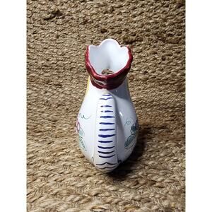 This vintage Derutta Girasole Italy rooster pitcher is a unique and handmade piece of Italian pottery. Hand painted with intricate grape patterns in shades of white, green, yellow, red, blue, and black, this round pitcher stands tall at 8 inches. Crafted in Umbria, this art pottery piece is not only functional but also decorative, making it a charming addition to any kitchen or dining area. With its rustic design and Italian flair, this pitcher is a true representation of vintage craftsmanship and artistic flair.