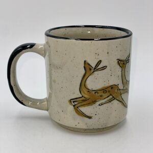 Charming vintage stoneware mug featuring hand-painted leaping deer in warm golden tones against a speckled cream glaze. The rim and handle are accented with a darker glaze for contrast. While unmarked, the style and quality are reminiscent of Otagiri ceramic mugs.
