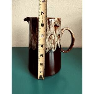 Enhance your home decor with this beautiful vintage pottery stoneware pitcher, featuring a captivating brown salt drip glaze. Standing at 6.5 inches tall with a top diameter of 3.5 inches and a bottom diameter of 4.5 inches, this unique pitcher is perfect for serving beverages or as a charming decorative piece. Its rustic aesthetic and high-quality craftsmanship make it a standout addition to any vintage or farmhouse-style kitchen.