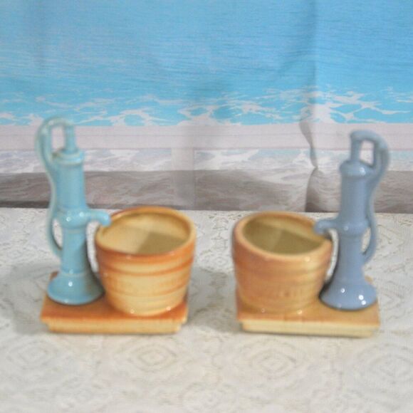 Offering two vintage pottery water pump and bucket small planters each approximately 7" tall.