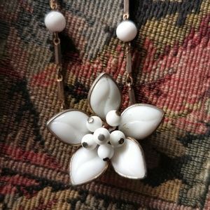 Vintage Poured Glass Necklace 14" White Beads & Flowers plus Earrings