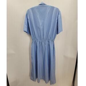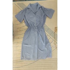 Vintage Powder Blue White Polka Dot Short Sleeve Elastic Waste Button Up Bodice Midi A-Line Dress