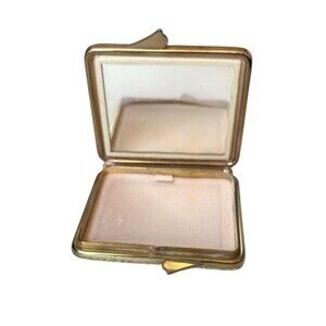 This vintage powder compact is a stunning piece made of hand-tooled Italian leather in ivory with gold accents. Measuring 3 x 2-3/4 inches, this collectible item from the 1930s-1940s exudes elegance and sophistication. Crafted in Italy, this compact is a rare find for collectors of vintage vanity items and is sure to add a touch of luxury to any display.