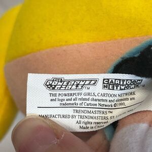 The product is a vintage Powerpuff Girls Bubbles plush doll from 1999, featuring faux leather shoes made by Trademasters. This small-sized stuffed animal was manufactured in China and belongs to the Powerpuff Girls character family. The faux leather shoes add a unique touch to this collectible item, making it a special addition to any vintage toy collection.