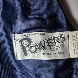 This vintage Powers mens basketball jersey is a size 46 in dark navy blue with ENID 25 in white and grey lettering and grey trim. Made by Powers, it has a classic basketball style with a sporty look.