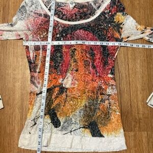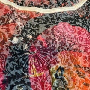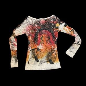 Vibrant long sleeve top with artistic design. Features shades of orange, pink, and black.