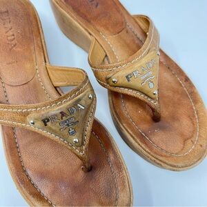Vintage Prada 90s Y2K Brown Tan Triangle Logo Platform Wedge Thong Sandals 37 7