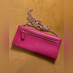 Elevate your style with the Prada Pink Chain Wallet. This chic accessory features a vibrant pink hue, perfect for any occasion. This is in above good condition. Some rubbing on the leather but have to look closely. Fabulous color and comes with free chain!