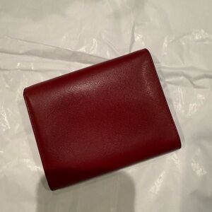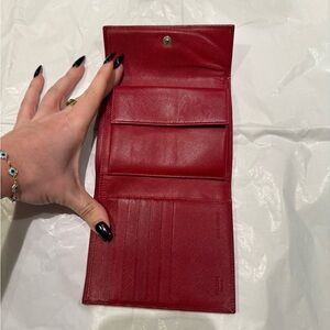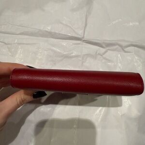 Chic Prada wallet in rich crimson leather. Features iconic logo detail.