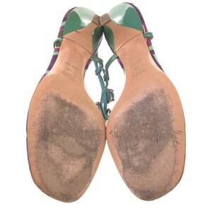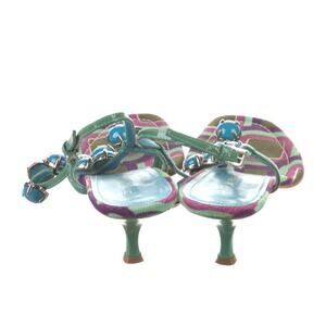 Women’s vintage PRADA heels! Featuring a stunning multicolor blue green pattern and jewel accents, these T-strap mules are perfect.