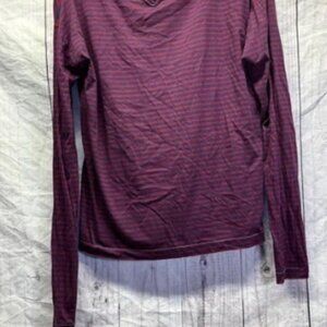 This is a vintage Prada long sleeve t-shirt for women in size Large. It features a striped pattern in multicolor, a crew neck, and pockets. The style is basic with a retro touch, making it a unique and fashionable choice for casual wear.