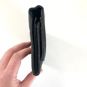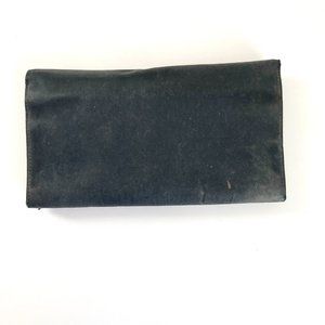 This vintage Tesstuto black nylon tri-fold wallet from Prada is eye-catching, practical and durable--the perfect combo! Wallet features interior credit and bill slots, two snap closures and of course the iconic triangle Prada logo on the front. Wallet exterior shows obvious signs of wear given its age and a minor stain on back (piece is early 2000's) and some minor wear to outer edges of interior leather (see photos). Condition reflected in price.