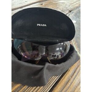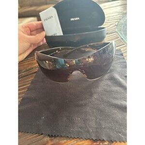 The product is a pair of vintage Prada wave sunglasses in brown, suitable for unisex adults. This preowned item comes with a case and towel, adding to its value and convenience for the wearer. The iconic Prada brand, along with the stylish design of the sunglasses, would make this accessory a fashionable and timeless addition to any outfit.