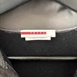 Vintage Prada athletic contrast piping scuba knit fleece fitted zip up jacket. Athletic sport lounge style fleece-lined track jacket sweatshirt. Double zipper, Prada logo on side. Size M but measures more fitted, so listing as S. G8.