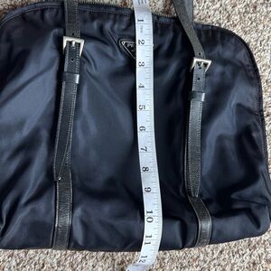 Featuring a two sides zipper closure. - One interior zip pocket closure. - Prada navy blue interior lining throughout. - Condition: A bit stains on the inside. Other than that, the bag is in great condition. - Length: 15 inches. Height: 11 inches. Width: 5 inches. Handle Drop: approximately from 12 to 13 inches since it is adjustable.