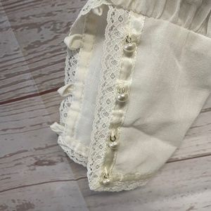 high neck, long sleeves with ruffle, lace, mesh, pearl tone buttons, ribbon detailing