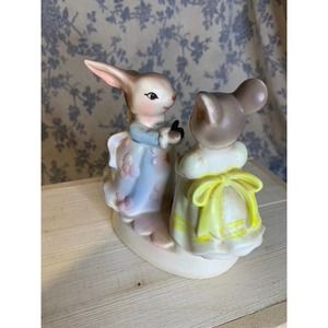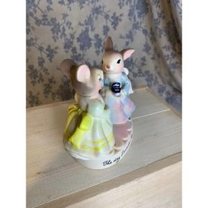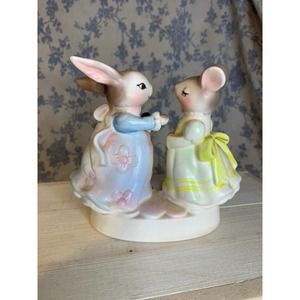 Figurine features two light brown bunnies / rabbits in dresses. The bunny in a blue and pink floral gown holds a small jewelry box and holds her hand out to the solemnly proud bunny in the yellow and green gown.