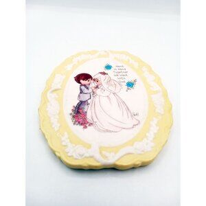 This Vintage Precious Moments Ceramic Wall Plaque is a heartfelt addition to any home. It features an 4.5-inch oval design in soft cream and yellow, with the touching sentiment, "Hand In Hand Together We Walk With God."