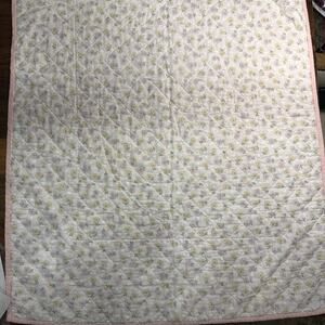 This Vintage Precious Moments Pink Baby Blanket features a charming design of ducks, girls, bows, bunnies, and flowers, perfect for a girl's crib. Made from a soft cotton blend material, this white blanket with pink accents is adorned with a quilt-like pattern and bunny characters. Made in the United States, this adorable baby blanket is a timeless piece that adds a touch of nostalgia to any nursery.