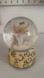 Delightful snow globe with an angel inside. Features a base with yellow stars and elegant swirls.