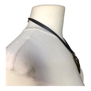 This vintage Premier Designs necklace is a bold and stylish statement piece, featuring a multi-cord black design accented by three round brass-tone pendants.