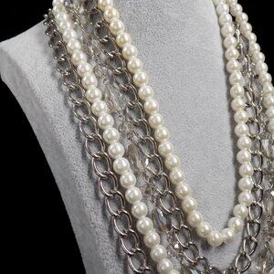 Vintage Premier Designs Faux Pearl Multi Layer Necklace Silver Tone Chunky Chain Magnetic Closure