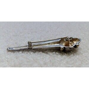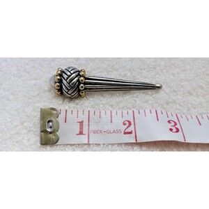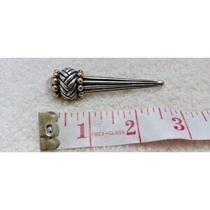 Add a touch of modernist elegance to your outfit with this vintage Premier Designs brooch. Measuring 3 inches in length, this piece features a stunning mix of gold and silver tones in a sleek, yet subtle design. The brooch is signed and crafted from mixed metals, making it a unique addition to any jewelry collection.