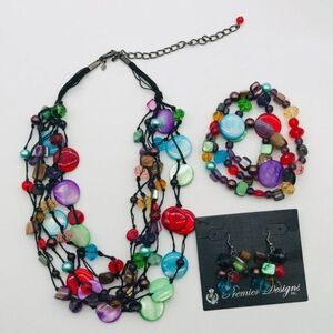 Vintage Premier Designs Parure Chunky Hand Knotted 7 Layer Multi-Strand Necklace, Earrings, Bracelet Set. Featuring bright primary colored glass crystals, dyed shell, faux pearl & genuine tigers eye stones and beads. The necklace features an extender and the bracelet is stretch for adjustable fit. This set is in excellent vintage condition. Please feel free to ask questions.