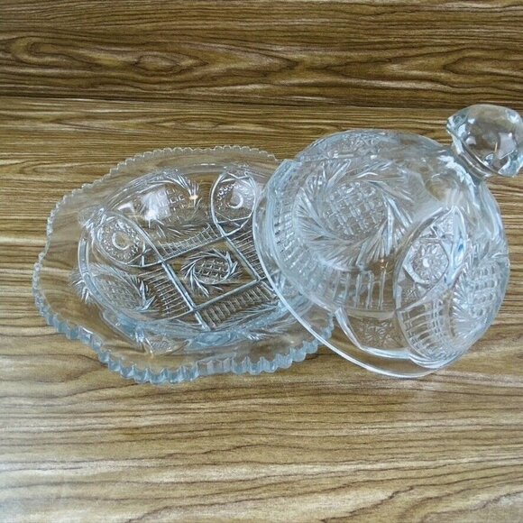 Vintage Pressed Domed Glass Butter Dish Round Clear Aztec Sunburst